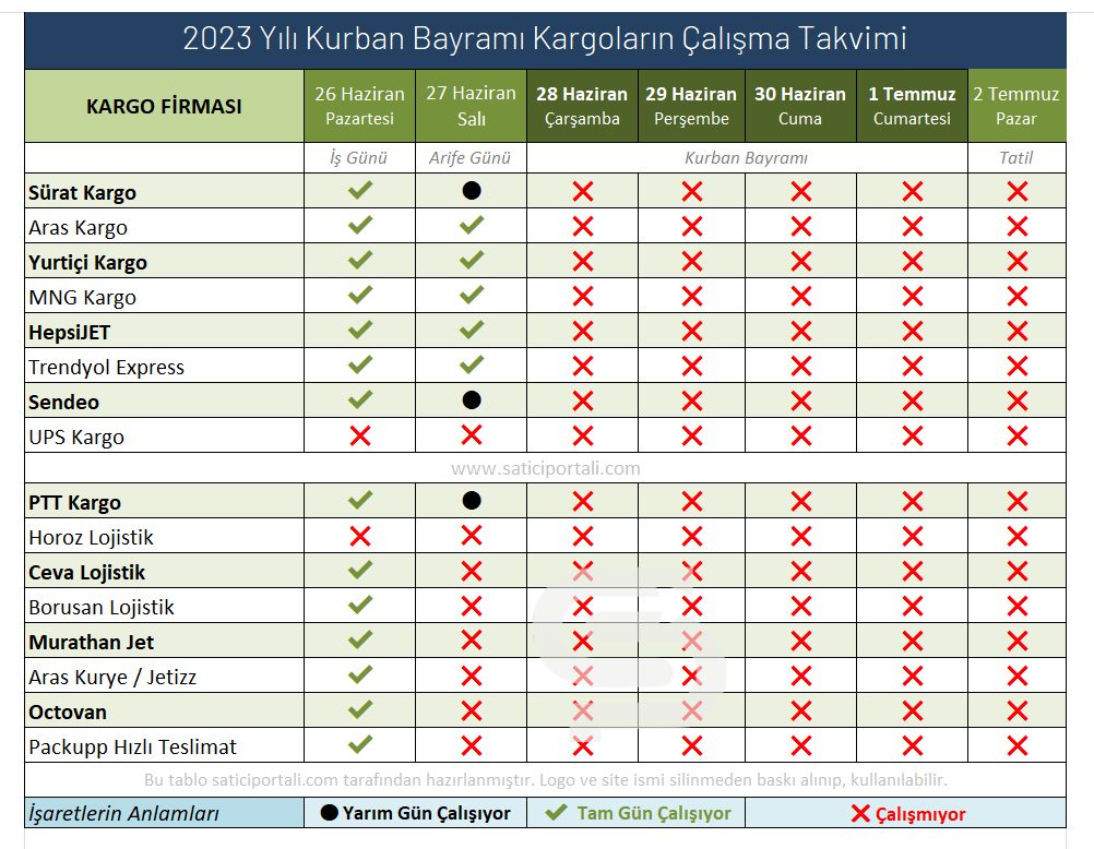 2023 yılında Kurban Bayramı 28 Haziran Çarşamba günü başlayıp, 1 Temmuz Cumartesi günü son buluyor. Arife günü ise 27 Haziran Salı gününe denk geliyor. Kargo firmalarından henüz net bilgi gelmese de tüm firmaların Arife günü tam günü çalışmasını tahmin ediyoruz.